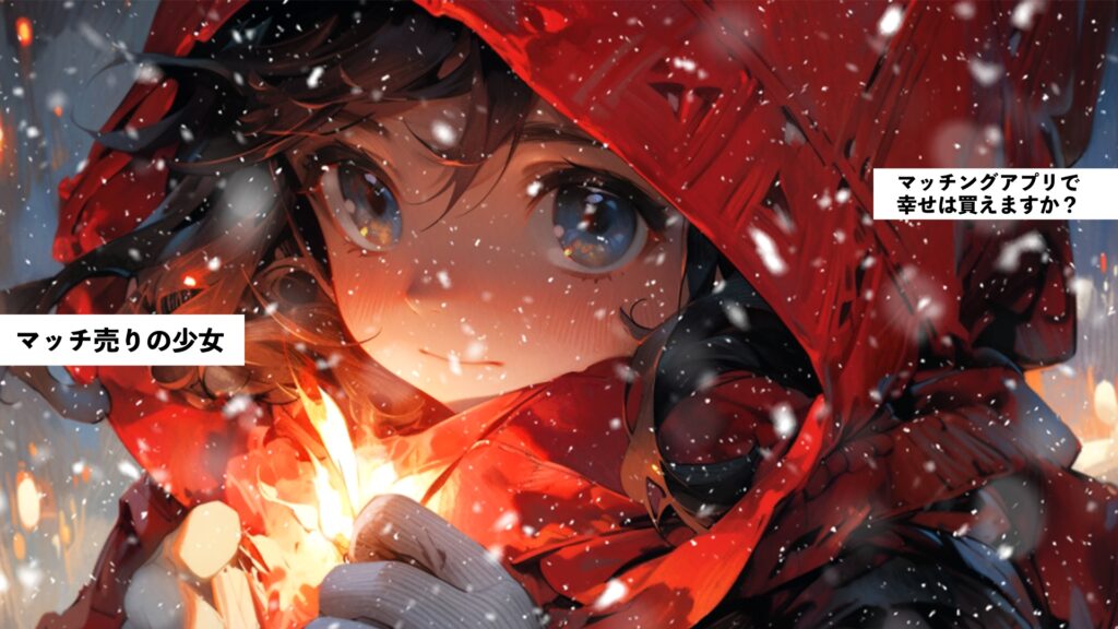 take2worksのYouTubeでは初期の頃、世界の名作を竹馬タケルなりに『現代風にアレンジ』をしたAIイラスト使用の応援動画を配信しています。 今回は「マッチ売りの少女」を通して「悲劇も幸福に変えられる」気持ちにな … 続きを読む マッチ売りの少女(竹馬タケル版ショート動画)
