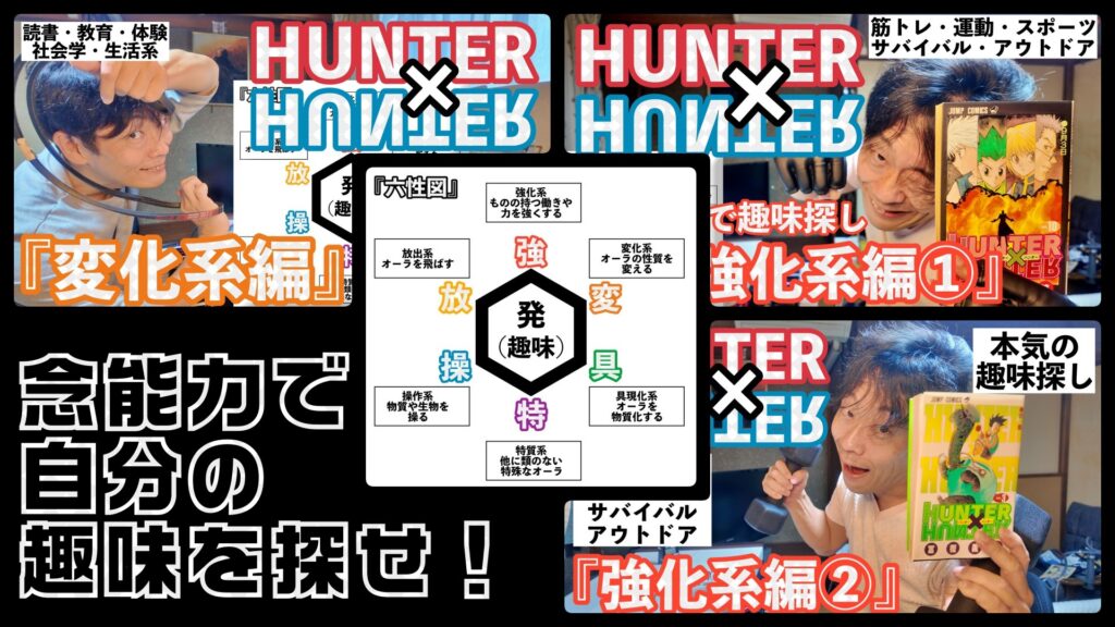 take2worksのYouTubeではマンガHUNTER×HUNTERが大好きな竹馬タケルが『念能力の6性図』から系統別に趣味を網羅した趣味探し応援動画を配信しています。 今回は「ハンターハンター」を通して「現実を冒険 … 続きを読む 念能力で楽しく趣味を探そうぜ【強化系&変化系編】