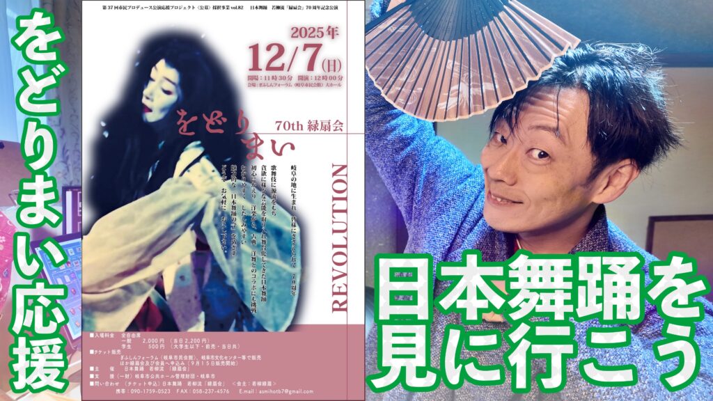 take2worksのYouTubeでは2025/12/07(日)に日本舞踊の舞台を観に行く竹馬タケルが岐阜県の日本舞踊を応援動画を配信しています。 今回は「日本舞踊」を通して「舞台に行く前の基礎知識」をお伝えしたいと共 … 続きを読む 岐阜県の日本舞踊“をどりまい”を観に行こうぜ🪭